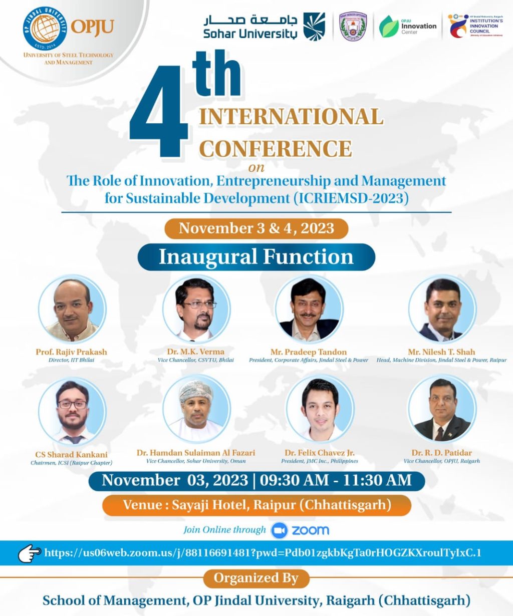 रायपुर, ओपी जिंदल विश्वविद्यालय, रायगढ़ के स्कूल ऑफ़ मैनेजमेंट द्वारा ‘रोल ऑफ़ इनोवेशन, आंत्रप्रेन्योरशिप एन्ड मैनेजमेंट फॉर सस्टेनेबल डेवलपमेंट’ विषय पर दो-दिवसीय चतुर्थ अंतर्राष्ट्रीय सम्मेलन का आयोजन 3 – 4 नवम्बर 2023 के दौरान किया जाएगा। सम्मलेन का आयोजन रायपुर के सयाजी होटल में हाइब्रिड मोड में किया जायेगा। सम्मलेन के वाइस चेयरमैन एवं स्कूल ऑफ़ मैनेजमेंट के प्रमुख डॉ साकेत जेसवानी ने बताया की सोहर विश्वविद्यालय, ओमान एवं जोश मारिया कॉलेज, फिलीपींस के सहयोग से आयोजित इस अंतर्राष्ट्रीय सम्मेलन का उद्देश्य इनोवेशन, आंत्रप्रेन्योरशिप एन्ड मैनेजमेंट क्षेत्रों से जुड़े हुए सभी स्टेक होल्डर्स को एक मंच पर लाना तथा सतत विकास में इनकी भूमिका पर चर्चा करना , एवं नवाचारों के साथ-साथ सतत विकास की व्यावहारिक चुनौतियों का सामना करने अपनाए जाने वाले समाधानों को प्रस्तुत करने और चर्चा करने के लिए एक प्रमुख अंतःविषय मंच प्रदान करना है। अकादमिक और उद्योगों के विशिष्ट वक्तागण इनोवेशन, आंत्रप्रेन्योरशिप एन्ड मैनेजमेंटसे संबंधित अन्य क्षेत्रों पर मुख्य रूप से अपने विचार प्रस्तुत करेंगे।
