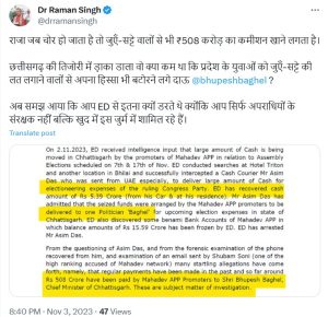 पूर्व मुख्यमंत्री ने आगे कहा कि पहले से ही लगातार महादेव सट्टा एप के तार मुख्यमंत्री भूपेश बघेल के सचिवालय से जुड़ रहे थे और अब तो स्पष्ट हो गया कि इन सब में भूपेश की सीधी सलिप्तता है और यह भी स्पष्ट हो गया कि मुख्यमंत्री भूपेश बघेल को इतना अति आत्मविश्वास क्यों रहता है कि चुनाव जीत जाऊंगा क्योंकि यह तो एक महादेव एप है जहां से मुख्यमंत्री भूपेश बघेल ने 508 करोड़ की अवैध राशि इकट्ठा की है न जाने ऐसे ही और कितने जगहों से उन्होंने चुनाव को प्रभावित करने के लिए पैसा इकट्ठा किया है।
