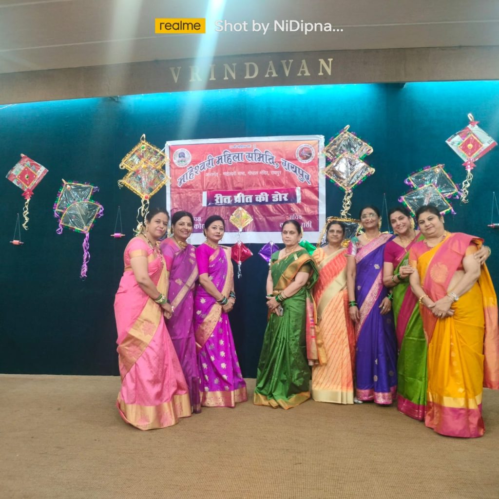 माहेश्वरी महिला समिति गोपाल मंदिर रायपुर द्वारा ने *रीत-प्रीत की डोर* हल्दी-कुंकुम का प्रोग्राम *दिनांक 15 जनवरी 2024 सोमवार अपराह्न 3:00 बजे से वृन्दावन हाल,सिविल लाइन* में आयोजित किया। मकरसंक्रान्ति के उपल्क्षय मे हल्दी-कुंकुंम के साथ सांस्कृतिक का रंगारंग कार्यक्रम रखा गया। महाराष्ट्रीयन Dress-up मे आकर सदस्यों ने अपनी उपस्थिति दर्ज करायी।इसमें लगभग 150 सदस्य ने अपनी सहभागिता दी।