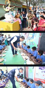 डॉ गौरव सिंह आज सुबह सपरिवार स्कूल पहुंचे सबसे पहले सरस्वती माता का वंदन किया। उसके बाद वे बच्चों के बीच पहुंचे और उन्हे पंगत में बैठाया और वन बाई वन थाली लगाई। उसके बाद पूडी, सब्जी, दाल, चावल और खीर परोसा, यहीं नही वे बच्चों के पास जाते रहे और उनकी पसंद पूछकर व्यंजन को फिर से परोसा और अंत में बच्चों को केक खिलाया। उनके साथ एसपी श्री संतोष सिंह, डीएफओ श्री विश्वेश्वर राय, नगर निगम आयुक्त श्री अबिनाश मिश्रा और जिला पंचायत के सीईओ श्री विश्वदीप ने भी भोजन परोसा। साथ ही कलेक्टर ने इन स्कूली बच्चों के बीच बैठ पत्नी डॉ सुनिता सिंह और दोनो बच्चे आद्या सिंह और अक्षरा सिंह के साथ भोजन किया।