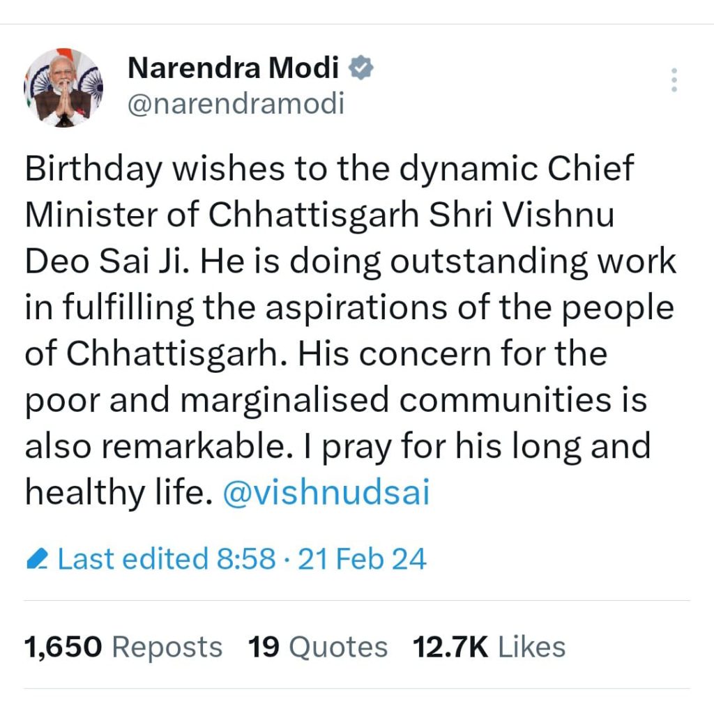 प्रधानमंत्री ने लिखा कि श्री साय छत्तीसगढ़ की जनता की आकांक्षाओं को पूरा करने में उत्कृष्ट कार्य कर रहे हैं। गरीबों और वंचित समुदायों के प्रति उनकी चिंता भी उल्लेखनीय है। मैं उनके लंबे और स्वस्थ जीवन के लिए प्रार्थना करता हूं।