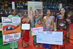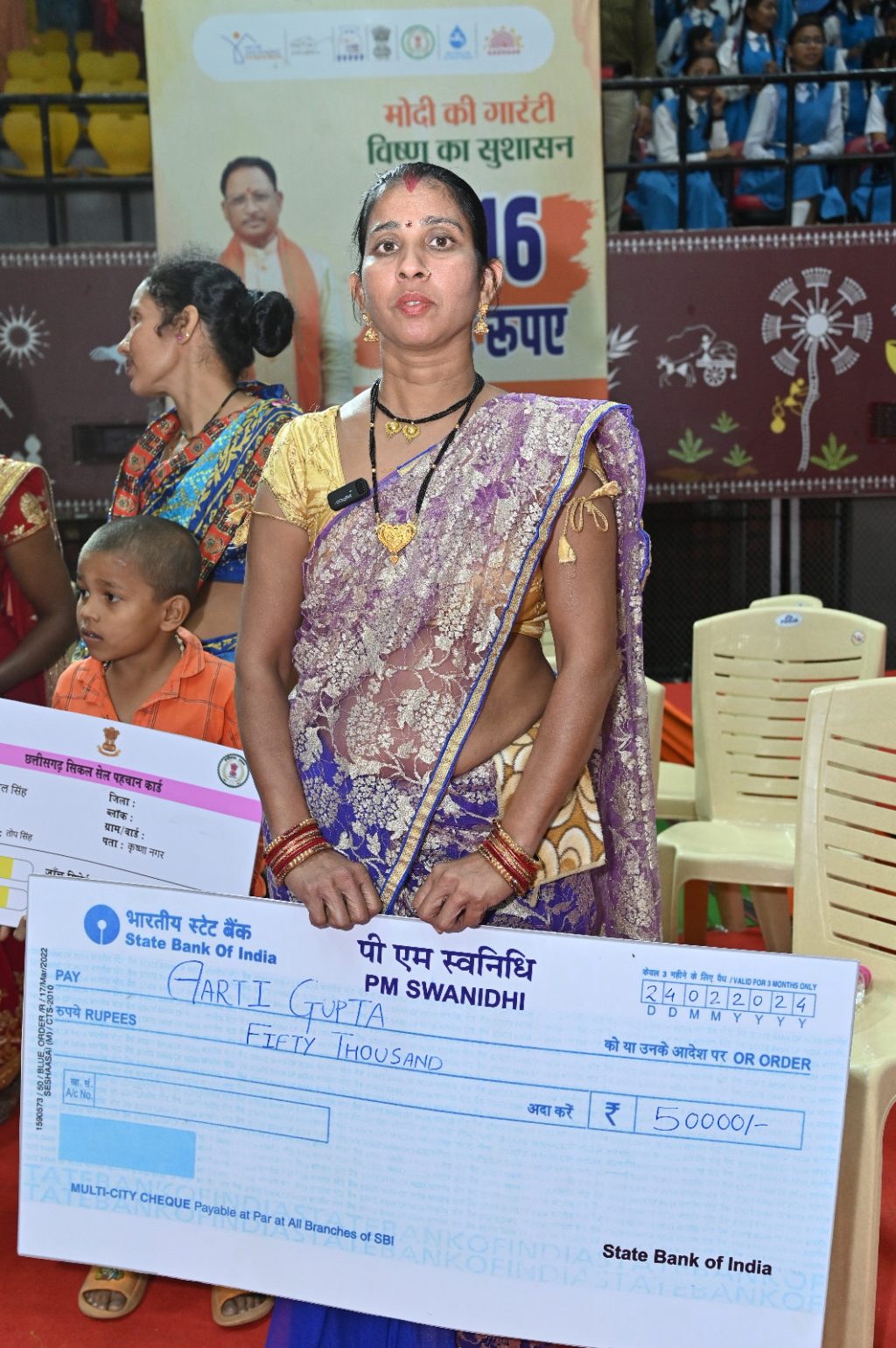 रायपुर 24 फरवरी 2024/ विकसित भारत, विकसित छत्तीसगढ़ कार्यक्रम राजधानी के बूढ़ापारा स्थित इंडोर स्टेडियम में आयोजित हुआ। इसमें मुख्यमंत्री श्री विष्णुदेव साय ने हितग्राहियों को विभिन्न योजनाओं से लाभान्वित करते हुए प्रमाण-पत्र सौंपा। इन हितग्राहियों ने प्रधानमंत्री श्री नरेंद्र मोदी और मुख्यमंत्री श्री विष्णुदेव साय को धन्यवाद दिया और आम नागरिकों से भी शासन की योजना का लाभ लेने के लिए आग्रह किया।