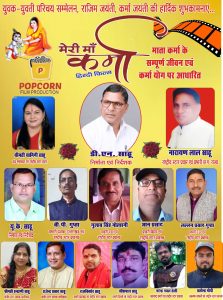 आप सभी सामाजिक सदस्यों, कार्यकर्ताओं, पदाधिकारियों,महिला, पुरुष, युवा प्रकोष्ठ से संबधित सदस्यों, ग्राम, वार्ड, परिक्षेत्र, ब्लाक, तहसील, जिला संभाग, प्रदेशसदस्यो, मेरी मां कर्मा हिंदी फिल्म के ग्राम, ब्लाक,तहसील, जिला, संभाग, प्रांतीय, राष्ट्रीय स्टार प्रचारक गणों, मेरी मां कर्मा के प्रति अनुराग रखने वाले सभी लोगों को सूचित किया जाता है कि दिनांक 01/03/2024 दिन शुक्रवार को समय 12 से कमल विहार सेक्टर 06 रायपुर, पुराना धमतरी रोड मे अति आवश्यक बैठक रखा गया है, जिसमे 05 अप्रैल कर्मा जयंती समारोह आयोजित करने एवम मेरी मां कर्मा हिंदी फिल्म को भारत देश के सभी राज्यों के टाकीज मे प्रदर्शित करने हेतू कार्ययोजना तैयार किया जाना है।