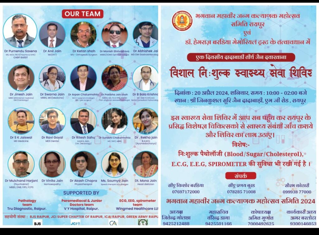 एवं डॉ हेमराज बरडिया मेमोरियल ट्रस्ट के संयुक्त तत्वावधान में विशाल निशुल्क एक दिवसीय स्वास्थ्य शिविर 20 अप्रैल , शनिवार को रायपुर के एमजी रोड, जैन दादाबाड़ी में सुबह १० से दोपहर २ बजे तक संचालित होने जा रहा है। कार्यक्रम के मुख्य अतिथि VY हॉस्पिटल के प्रबंध संचालक एवं राष्ट्रीय स्वयंसेवक के क्षेत्र संघ चालक डॉ पूर्णेंदु सक्सेना जी मौजूद रहेंगे। पिछले कई वर्षों से विशाल स्वास्थ्य सेवा शिविर का संचालन जैन समाज द्वारा दादाबादी में किया जाता है ।