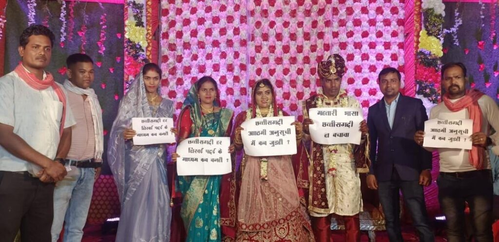 बिलासपुर। छत्तीसगढ़ी भाषा की लड़ाई अब शादी पंडाल तक पहुंच गई है, बेलपान बिलासपुर से साहू परिवार का बारात मोपका बिलासपुर आया था। वही मरावी परिवार का बारात हरदी बिल्हा से सिरगिट्टी बिलासपुर आया था, दोनों जगहों पर वर वधु द्वारा छत्तीसगढ़ी भाषा का पोस्टर लहराकर बाराती, घराती को मातृभाषा के प्रति जागरूक किया साथ ही सरकार से मांग किया की छत्तीसगढ़ी को पढ़ाई लिखाई का माध्यम और आठवी अनुसूची में शामिल करने के लिए गंभीर प्रयास करे। इस अनूठे प्रदर्शन का चारो तरफ चर्चा हो रही है, छत्तीसगढ़ी भाषा के लिए काम कर रहे क्रांति सेना, एम ए छत्तीसगढ़ी, मोर चिन्हारी छत्तीसगढ़ी समेत विभिन्न संगठन के दर्जन भर युवा ने दोनों जोड़ो मंच पर पोस्टर लहराने की बात रखी जिसे वर वधु के सहर्ष सहमति के बाद तख्ती के साथ लहराया गया। इस अवसर पर भाषा के लिए संघर्षरत ठा शैलु छत्तीसगढ़िया, अनिल कुमार पाली, महावीर निषाद, प्रदीप साहु, संदीप साहू, राजकुमार, समेत दोनों शादी के हजारों बाराती-घराती उपस्थित रहें और सभी ने एक स्वर में छत्तीसगढ़ी भाषा के विकास में योगदान देने के बात कही।