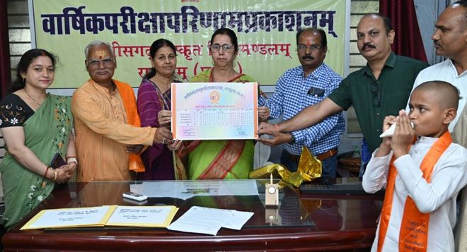 रायपुर। छत्तीसगढ़ संस्कृत विद्यामण्डलम् रायपुर के सचिव श्रीमती अलका दानी द्वारा आज छत्तीसगढ़ संस्कृत विद्यामण्डलम् रायपुर आयोजित वर्ष 2024 का मुख्य परीक्षा परिणाम विद्यामण्डलम् कार्यालय में घोषित कर दिया गया है। परीक्षा परिणाम 96.35 प्रतिशत रहा। जिसमें कुल 3 हजार 504 परीक्षार्थी (कक्षा 9वीं से 12वीं तक) शामिल हैं, जिसमें बालक 2 हजार 90 एवं बालिकाएं 1 हजार 414 हैं। वर्ष 2024 की मुख्य परीक्षा के लिए छत्तीसगढ़ में कुल 41 परीक्षा केन्द्र बनाए गए थे जिसमें (9वीं से 12वीं) में 3 हजार 196 परीक्षार्थी परीक्षा में सम्मिलित हुए जिसमें बालक 1 हजार 891 और बालिकाएं 1 हजार 305 उत्तीर्ण हुए।