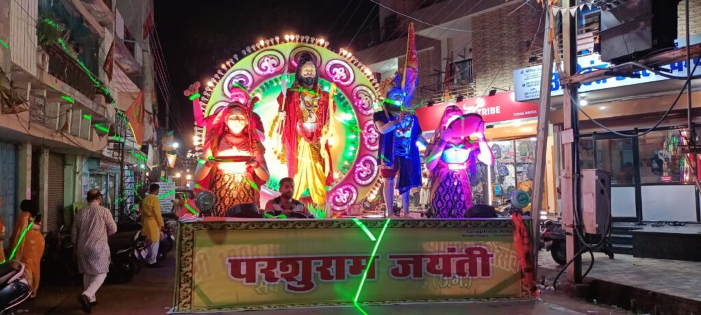 दुर्ग – भगवान परशुराम जन्मोत्सव शोभायात्रा ब्राह्मण समाज दुर्ग भिलाई द्वारा पूर्व निर्धारित कार्यक्रम के अनुसार बहुत ही गरिमामय सनातन सन्देश के साथ निकाली गई। दुर्ग भिलाई सहित प्रदेश के विभिन्न स्थानों से पधारे सभी ब्राह्मण परिवार अग्रसेन भवन अग्रसेन चौक पर समयानुसार उपस्थित हुए, सर्वप्रथम शोभायात्रा कार्यक्रम के शुभारम्भ पर भगवान परशुराम के छायाचित्र एवं विशाल रथ पर विराजित भगवान परशुराम की पूजा अर्चना व महाआरती की गई.तत्पश्चात शोभायात्रा प्रारम्भ हुई। पंडित सुरेन्द्र शर्मा, आनंद महाराज, देवेश मिश्रा, अभिषेक अवस्थी, अजय शर्मा, श्याम शर्मा,कमल नारायण शर्मा,ललित मिश्रा, सुदेश धर दीवान,प्रदीप पाण्डेय, अंजय दुबे, शशिकांत तिवारी,राजेंद्र दुबे,राहुल दीवान, शिवाकांत तिवारी,बीरेंद्र पाण्डेय, प्रभुनाथ मिश्रा,लक्ष्मीकांत तिवारी, अनीता तिवारी, सुमन पाण्डेय, तूलिका तिवारी, आरती शुक्ला, कमलेश तिवारी, सुरेश मिश्रा, लक्ष्मीकांत दुबे, राजेंद्र मिश्रा, बृजमोहन तिवारी, यशवंत तिवारी, तोशानंद शुक्ला सहित विप्रजनों ने भगवान परशुराम की भव्य आरती की।इस दौरान जय जय परशुराम, ब्राह्मण समाज की जय. ब्राह्मण एकता जिंदाबाद, के नारों से वातावरण गूंज उठा।एक अन्य रथ पर सवार भगवान परशुराम बने पंडित मनोज,दूसरे रथ पर विराजित छत्तीसगढ़ मैया,घोड़े, हाथों में फरसा, तलवार त्रिशूल लिए, परंपरागत धोती, पैजामा कुर्ता एवं महिलाये साड़ी व सलवार सूट, माथे पर तिलक त्रिपुण्ड, झंडे, अंगवस्त्र ब्राह्मणजनों की अलग ही छवि प्रस्तुत कर रही थी।