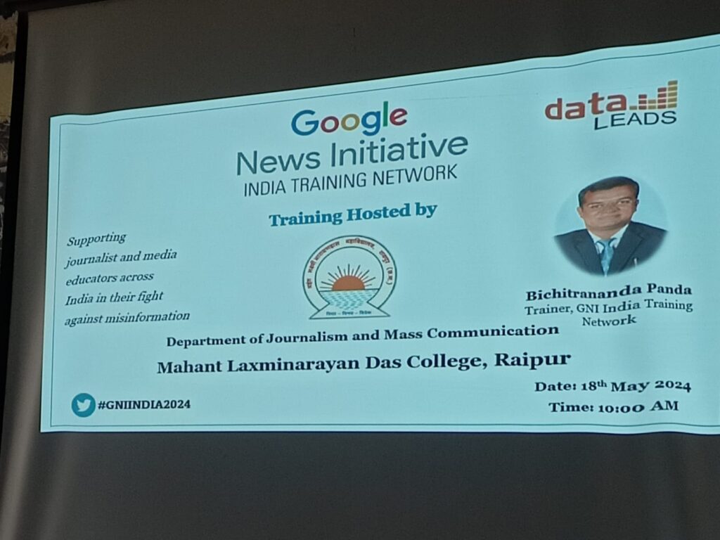 रायपुर के पत्रकारिता और जनसंचार विभाग ने गूगल न्यूज इनिशिएटिव (जीएनआई) इंडिया ट्रेनिंग नेटवर्क और डेटालीड्स के सहयोग से कॉलेज परिसर में “डिजिटल जांच, ऑनलाइन सत्यापन,