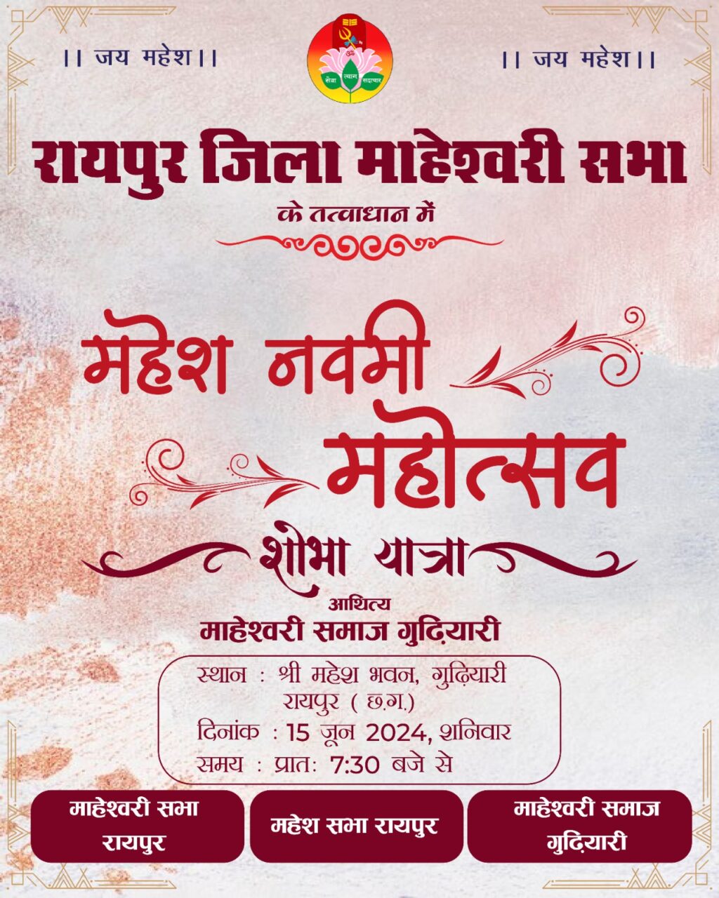 ।माहेश्वरी सभा,माहेश्वरी महिला समिति,महेश्वरी युवा मण्डल एवं माहेश्वरी युवा मंडल (महिला) का संयुक्त आयोजन है।माहेश्वरी सभा के पूर्व अध्य्क्ष स्व विजय कुमार दम्मानी के निधन होने से सादगी से महेश नवमी मनायी जाएगी ।