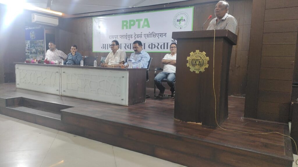 एवं उनके अधिकारियों के साथ चैम्बर ऑफ़ कॉमर्स के भवन में मीटिंग की गई , जी . एस. टी . अधिकारियों द्वारा नये नियम केa बारे में सभी प्लाईवुड ट्रेडर्स के सदस्यों को बताया तथा सदस्यों द्वारा जी. एस. टी में होने वाली परेशानियों को अधिकारियों का बताया गया एवं अधिकारियों द्वारा उसका निराकरण भी किया गया । इस मीटिंग में रायपुर प्लाईवुड ट्रेडर्स के अध्यक्ष श्री कन्हैया गुप्ता , चेयरमैन श्री विजय पटेल , संगरक्षक श्री विक्रम सिंह देव, महामंत्री श्री बाबू मोदी , संस्था के ख़ज़ांची श्री ए . के. त्रिपाठी एवं संस्था के वरिष्ठ सदस्यों के साथ क़रीब सौ सदस्य उपस्थित थे ।