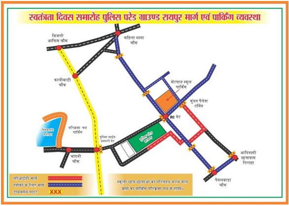 यातायात पुलिस रायपुर सभी वाहन चालकों से अनुरोध करती है कि वे VIP मार्ग को छोड़कर अन्य निर्धारित मार्गों का उपयोग करते हुए पार्किंग स्थल पर अपने वाहन पार्क करें और समारोह स्थल तक पहुंचें।