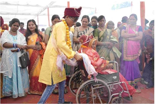 कोरबा के बालको की रहने वाली प्रतिभा बचपन से ही दिव्यांग है। दोनों पैर से लाचार प्रतिभा को लगता था कि पता नहीं उसके साथ कोई शादी करेगा भी या नहीं! शादी की यह ख्वाहिश एक दिन हकीकत में बदल गई जब चाम्पा निवासी अश्विनी साहू ने प्रतिभा का हाथ जीवन भर थामने का निर्णय लिया। दोनों के घर वालों की सहमति बनी और आर्थिक स्थिति ठीक नहीं होने पर दोनों का विवाह मुख्यमंत्री कन्या विवाह योजना अंतर्गत आज सीएसईबी पूर्व खेल मैदान में आयोजित सामूहिक विवाह समारोह में सम्पन्न हुआ। व्हीलचेयर के सहारे प्रतिभा ने सात फेरे लिए और पति अश्विनी ने उनके माथे पर सिंदूर भरा। दोनों परिवार की सहमति और दूल्हे के रजामंदी के साथ विवाह हुआ। इस दौरान महिला एवं बाल विकास विभाग के अधिकारियों ने विवाह की सम्पूर्ण औपचारिकता निभाई। परिजनों ने मुख्यमंत्री कन्या विवाह योजना से मिले सहयोग की प्रशंसा की और इसे गरीब परिवारों के लिए वरदान बताते हुए कहा कि सामूहिक विवाह का आयोजन होते रहना चाहिए ताकि गरीब परिवारो को आर्थिक बोझ न सहना पड़े। मुख्यमंत्री श्री विष्णुदेव साय ने भी आज 102 जोड़ो को आशीर्वाद प्रदान कर नव दाम्पत्य जीवन में प्रवेश पर बधाई दी।