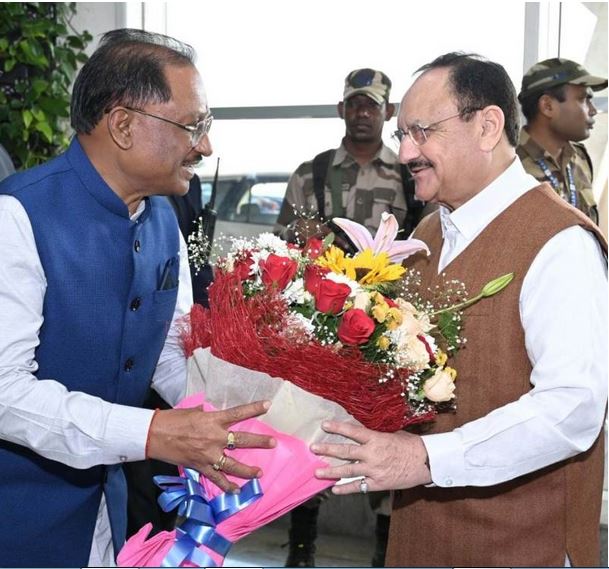 मुख्यमंत्री साय ने जेपी नड्डा का स्वामी विवेकानंद विमानतल पहुंचने पर पुष्प गुच्छ भेंटकर स्वागत किया। इस अवसर पर उप मुख्यमंत्री अरुण साव, विजय शर्मा सहित स्वास्थ्य मंत्री श्याम बिहारी जायसवाल, विधायक राजेश मूणत, सुनील सोनी एवं किरण देव सिंह ने भी केन्द्रीय स्वास्थ्य मंत्री का स्वागत किया।