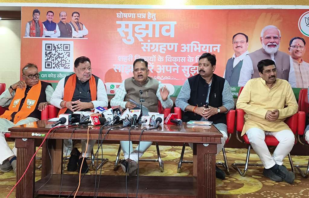 रायपुर। भारतीय जनता पार्टी ने नगरीय निकाय चुनावों की घोषणा पत्र को लेकर बुधवार को भाजपा कार्यालय एकात्म परिसर में पत्रकारवार्ता आहुत की। पत्रकार वार्ता को संबोधित करते हुए नगरीय निकाय चुनावों की घोषणा पत्र समिति के संयोजक अमर अग्रवाल ने कहा कि नगरीय निकायों में इस बार जनता से लिए गए सुझाव के आधार पर भाजपा अपना घोषणा पत्र जारी करेगी। इसके लिए उन्होंने whatsapp नंबर 9111014400 से, क्यूआर कोड को स्कैन करके और ई-मेल morsujhav@bjpcg.com अर्थात मोर सुझाव ऐट जी मेल डॉट कॉम के माध्यम से सुझाव मांगे है।