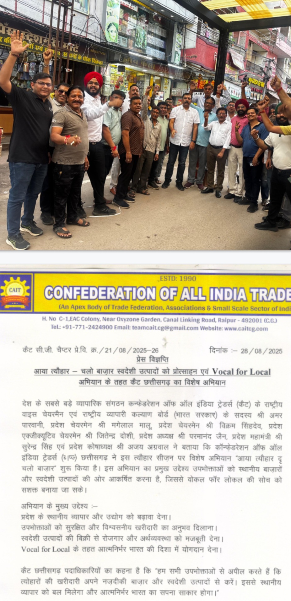 कैट छत्तीसगढ़ पदाधिकारियों का कहना है कि “हम सभी उपभोक्ताओं से अपील करते हैं कि त्योहारों की खरीदारी अपने नज़दीकी बाज़ार और स्वदेशी उत्पादों से करें। इससे स्थानीय व्यापार को बल मिलेगा और आत्मनिर्भर भारत का सपना साकार होगा।”
