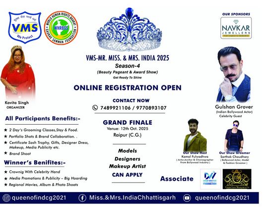 मिस, मिस्टर और मिसेज इंडिया 2025 और भारत गौरव सम्मान अवार्ड्स 2025 का आयोजन रायपुर, छत्तीसगढ़ में हो रहा है। इस आयोजन में सेलिब्रिटी गेस्ट श्री गुलशन ग्रोवर जी (बॉलीवुड अभिनेता), ग्रूमर श्री सार्थक चौधरी (बॉलीवुड अभिनेता और निर्माता) शामिल होंगे। शो को होस्ट कर रहे हैं श्री कमल फुलवाड़ा (बॉलीवुड अभिनेता और टेलीविजन अभिनेता)।