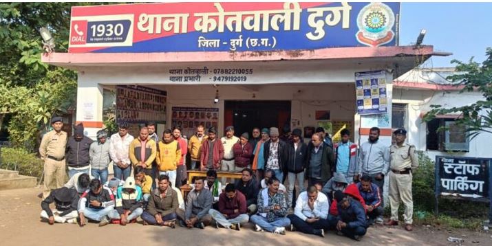 दुर्ग। सिटी कोतवाली दुर्ग पुलिस ने सोमवार देर शाम एक बड़ी कार्रवाई करते हुए गया नगर, कोस्टा तालाब के पास भागवत देशमुख के मकान में ताश पत्ती से होने वाले कथित जुए की सूचना पर दबिश दी। पुलिस ने मौके से 39 व्यक्तियों को संदिग्ध जुआ गतिविधि में संलिप्त पाते हुए हिरासत में लिया।