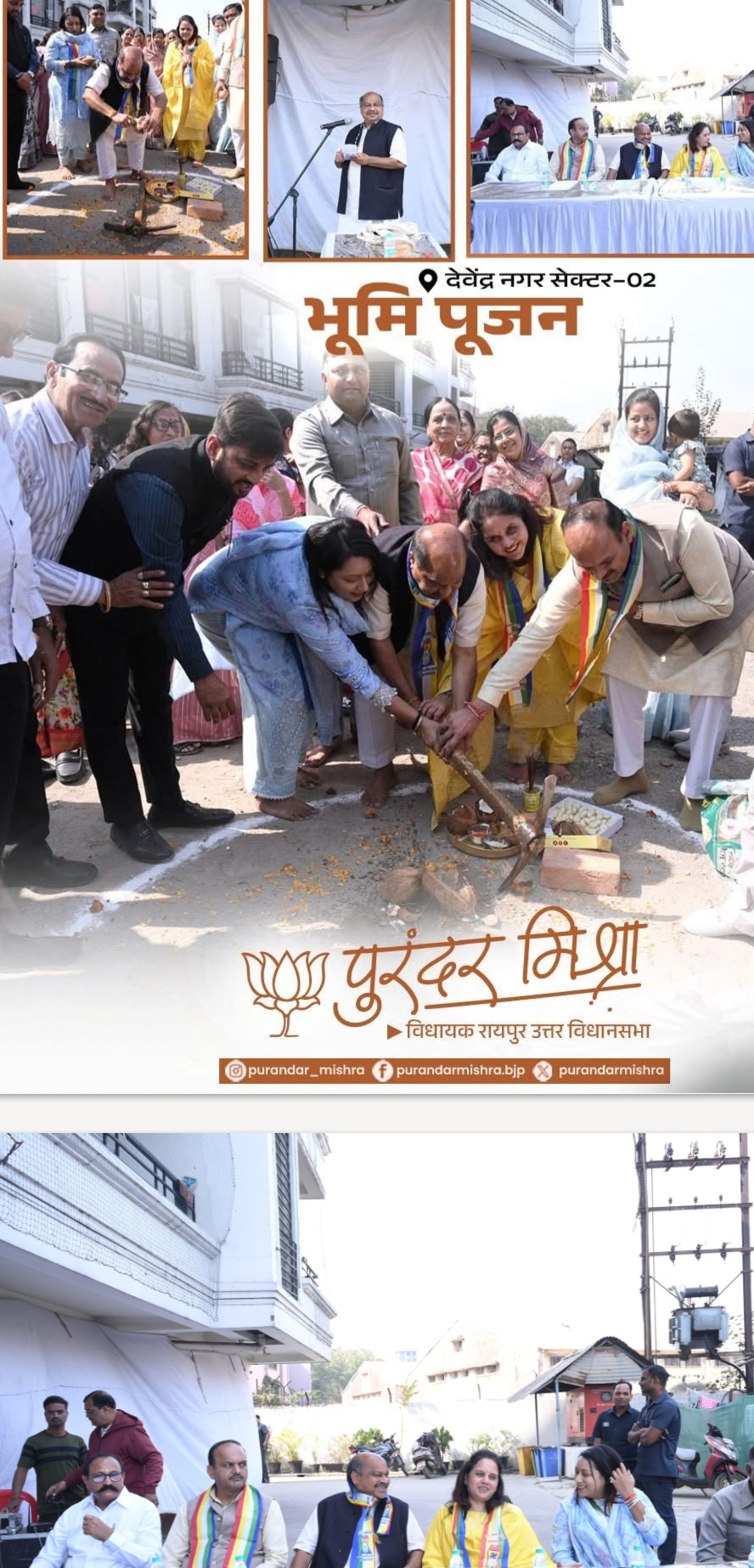 रायपुर। राजधानी रायपुर के देवेंद्र नगर सेक्टर–02 स्थित शीतल विहार कॉलोनी में आज सी.सी. रोड, नाली एवं पुलिया निर्माण कार्य का विधिवत भूमि पूजन उत्तर विधायक श्री पुरंदर मिश्रा एवं महापौर श्रीमती मिनल चौबे के करकमलों से सम्पन्न हुआ। इस अवसर पर क्षेत्रवासियों में उत्साह और प्रसन्नता का माहौल देखने को मिला।
