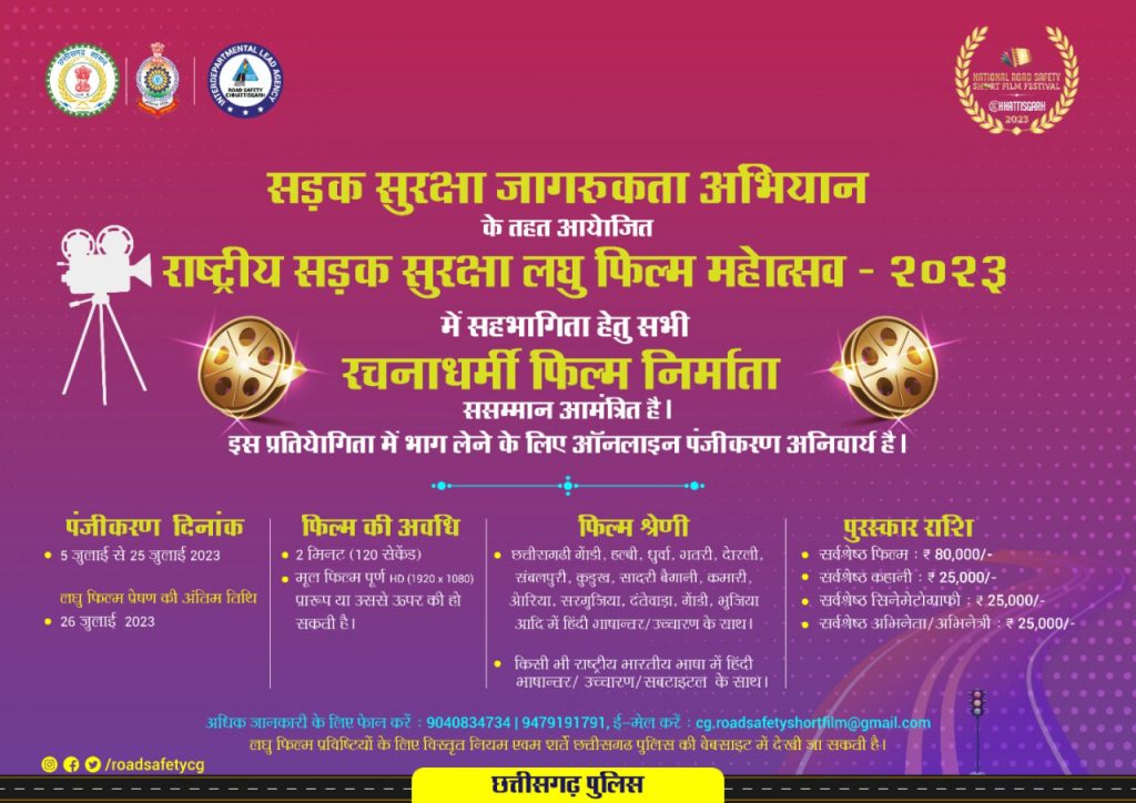 रायपुर, छत्तीसगढ़ पुलिस द्वारा सड़क सुरक्षा अभियान चलाया जा रहा है। इसके अंतर्गत अब लघु फिल्मों के जरिए भी जन जागरूकता के प्रयास किए जाएंगे। इसके लिए प्रदेश के रचनाधर्मी लोगों को सड़क सुरक्षा पर लघु फिल्म बनाने के लिए प्रेरित करते हुए राष्ट्रीय सड़क सुरक्षा लघु फिल्म महोत्सव 2023 के अंतर्गत प्रविष्टियां आमंत्रित की गई हैं।