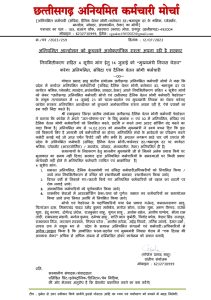 श्री रामकुमार सिन्हा प्रांतीय संयोजक छत्तीसगढ़ दैनिक वेतन भोगी कर्मचारी फेडरेशन ने बताया कि कांग्रेस ने अपने “जन-घोषणा-पत्र” के बिंदु क्रमांक 11 एवं 30 में अनियमित, संविदा एवं दैनिक वेतन भोगी कर्मचारियों को नियमित करने, छटनी न करने तथा आउट सोर्सिंग बंद करने का वादा किया है| अनियमित मंच से 14.02.2019 को माननीय मुख्यमंत्री ने स्वयं वचन दिए कि इस वर्ष किसानों लिए है आगामी वर्ष कर्मचारियों का होगा| अनियमित संघो के आवेदनों का परिक्षण करने कमेटी बनाई गई जो आज पर्यंत रिपोर्ट नहीं सौंप सकी है| अद्यतन लगभग साढ़े चार वर्ष उपरांत भी प्रदेश के अनियमित कर्मचारी (संविदा, दैनिक वेतन भोगी/कलेक्टर दर/श्रमायुक्त दर पर कार्यरत श्रमिक, प्लेसमेंट (आउटसोर्सिंग) / मानदेय, जॉबदर, अंशकालीन, ठेका) अनियमित ही है|