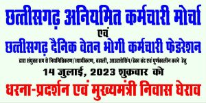 गोपाल प्रसाद साहू प्रांतीय संयोजक छत्तीसगढ़ अनियमित कर्मचारी मोर्चा ने कहा कि प्रदेश में कार्यरत अनियमित कर्मचारियों [संविदा, दैनिक वेतन भोगी, कलेक्टर दर, श्रमायुक्त दर पर कार्यरत श्रमिक, प्लेसमेंट, मानदेय, अशंकालिक, जाबदर, ठेका] अपने नियमितीकरण सहित 4 सूत्रीय मांगों को लेकर “छत्तीसगढ़ अनियमित कर्मचारी मोर्चा एवं छत्तीसगढ़ दैनिक वेतन भोगी कर्मचारी फेडरेशन” के संयुक्त तत्वावधान में 14 जुलाई 23 को धरना-प्रदर्शन एवं मुख्यमंत्री निवास का घेराव करेगा| कांग्रेस सरकार अनियमित आन्दोलन को कुचलने अलोकतांत्रिक रास्ता अपना रही है, ऐसे प्रयासों का हम कड़ी निंदा करते है|