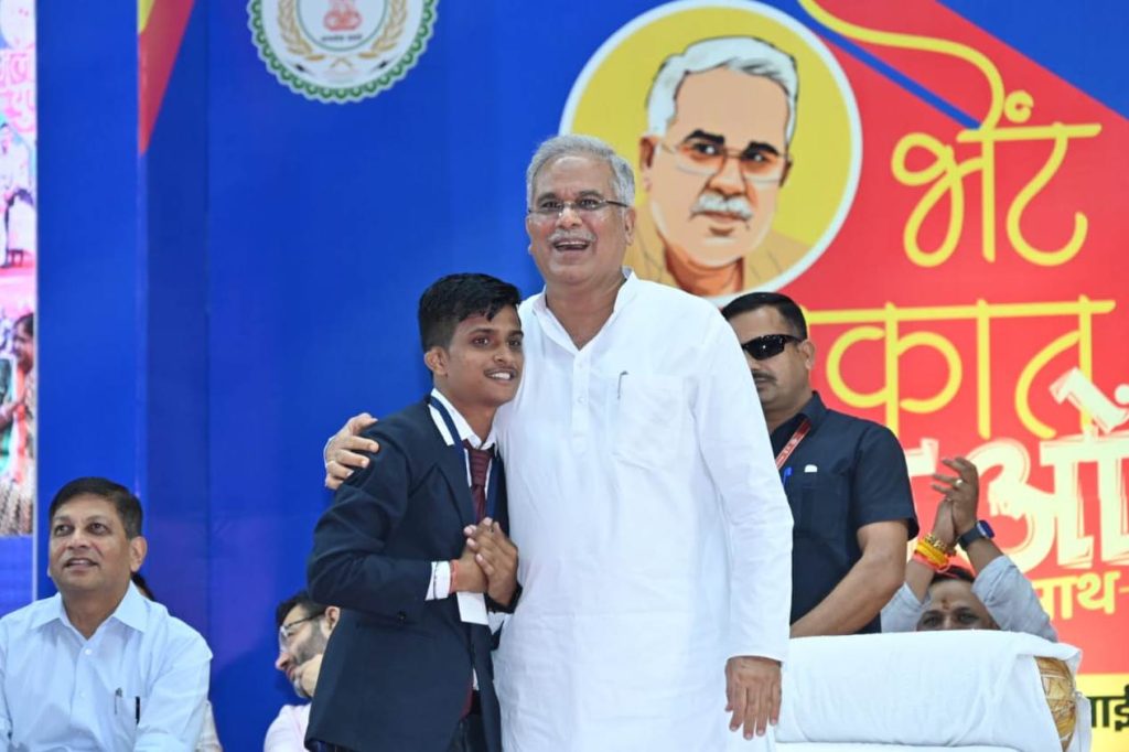रायपुर, मुख्यमंत्री श्री भूपेश बघेल ने राजधानी रायपुर के बूढ़ापारा स्थित इन्डोर स्टेडियम में युवाओं के साथ भेंट-मुलाकात कार्यक्रम में शामिल हुए। कार्यक्रम की शुरूआत में धमतरी से आये युवा सोमेश्वर गंजीर ने ऋग्वेद के श्लोकों के साथ सपनो का छत्तीसगढ़ विषय पर जोशीले तरीके से अपनी बात रखी। मुख्यमंत्री श्री भूपेश बघेल जोशीले भाषण से इतना खुश हुए कि सोमेश्वर को अपने पास बुलाकर गले लगा लिया और सिर पर रखकर आर्शिवाद दिया। मुख्यमंत्री ने सोमेश्वर के लिए युवाओं से खचा-खच भरे स्टेडियम में तालियाँ बजवायीं।