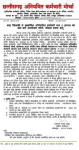 गोपाल प्रसाद साहू प्रांतीय संयोजक छत्तीसगढ़ अनियमित कर्मचारी मोर्चा ने बताया कि कांग्रेस सरकार प्रदेश के अनियमित कर्मचारियों को नियमित करने, आउट सोर्सिंग बंद करने तथा छटनी किये गए कर्मचारियों को रोजगार देने में टाल-मटोल कर रही है| प्रदेश में कार्यरत अनियमित कर्मचारियों [मानदेय, आउट सोर्सिंग, ठेका, सेवा प्रदाता, दैनिक वेतन भोगी, कलेक्टर दर, श्रमायुक्त दर पर कार्यरत श्रमिक, अशंकालिक, जाबदर, संविदा, सेवा से पृथक कर्मचारी] अपने नियमितीकरण सहित 4 सूत्रीय मांगों को लेकर “छत्तीसगढ़ अनियमित कर्मचारी मोर्चा, छत्तीसगढ़ आउट सोर्सिंग/ठेका कर्मचारी फेडरेशन” एवं नगर निगम अनियमित कर्मचारी महासंघ तथा छत्तीसगढ़ मध्यान्न भोजन रसोइया महासंघ के संयुक्त तत्वावधान में 6 अगस्त 23 को धरना-प्रदर्शन एवं जेल भरो आन्दोलन करेंगे| इस आन्दोलन में प्रदेश के 50 से अधिक अनियमित संगठनों के 10 हजार से अधिक अनियमित कर्मचारी सम्मिलित होंगे|