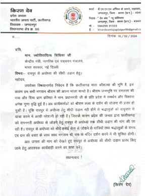 भाजपा प्रदेश अध्यक्ष किरण सिंह देव ने रायपुर से अयोध्या हवाई सेवा के लिए केंद्रीय मंत्री सिंधिया को दिया पत्र छत्तीसगढ़ भाजपा प्रदेश अध्यक्ष किरण सिंह देव ने रायपुर से अयोध्या हवाई सेवा के लिए केंद्रीय मंत्री सिंधिया को दिया पत्र Haritanjali Express February 20, 2024 दिल्ली में मुलाकात कर किया आग्रह रायपुर। भारतीय जनता पार्टी के प्रदेश अध्यक्ष किरण सिंह देव ने...Read More